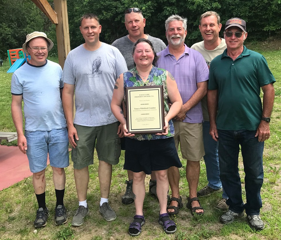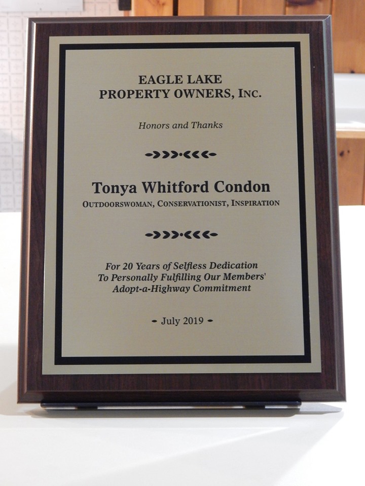Tonya C. receives recognition plaque for 20 years of adopt-a-highway clean-up efforts. the plaque was presented as part of the 2019 ELPOI annual meeting..
